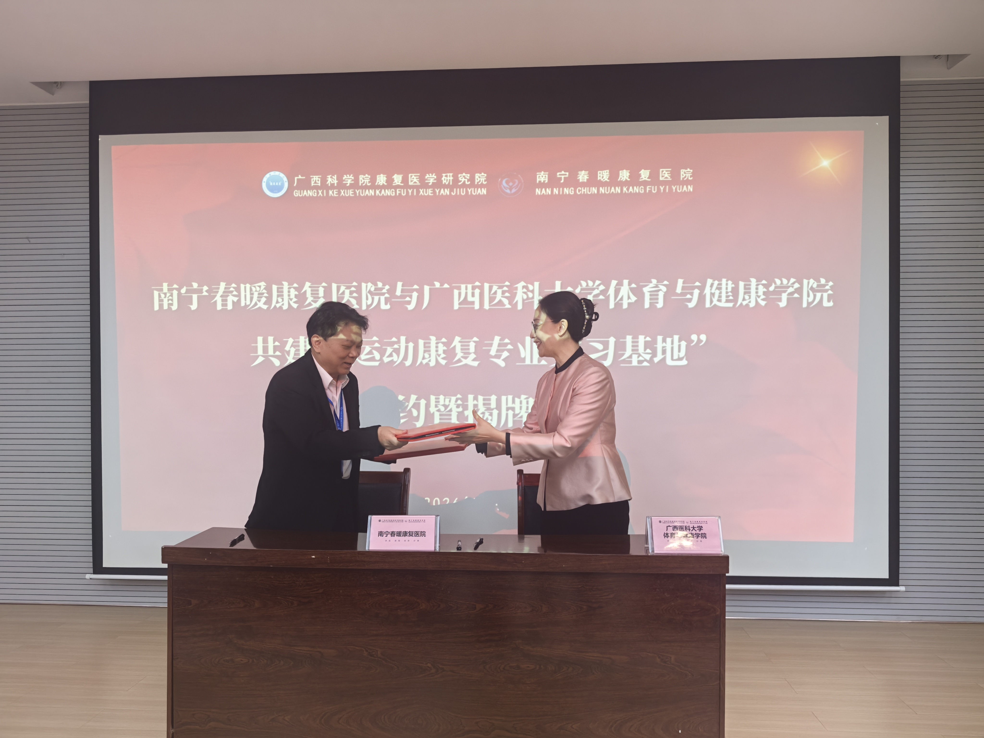 为推动医教协同发展,促进实习、就业一体化建设,提高运动康复人才培养质量。2026年3月13日,体育与健康学院党委书记、院长穆飒一行等7人前往南宁市春暖康复医院进行学生实习基地签订仪式。